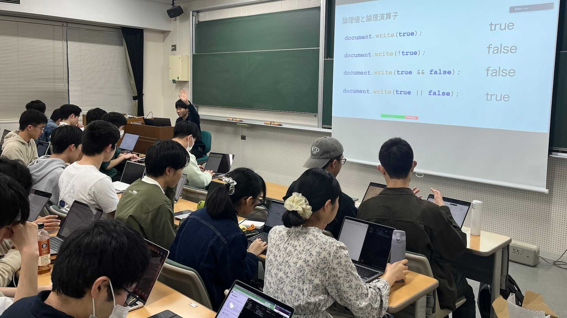 第 2 回講義からは、ut.code(); が独自に開発した教材である ut.code(); Learn を使って講義を進めています。第 2 回講義では、「はじめての Web 開発」「HTML」「JavaScript ことはじめ」「値と式と演算子」「変数」「論理値と論理演算子」「条件分岐」を扱いました。